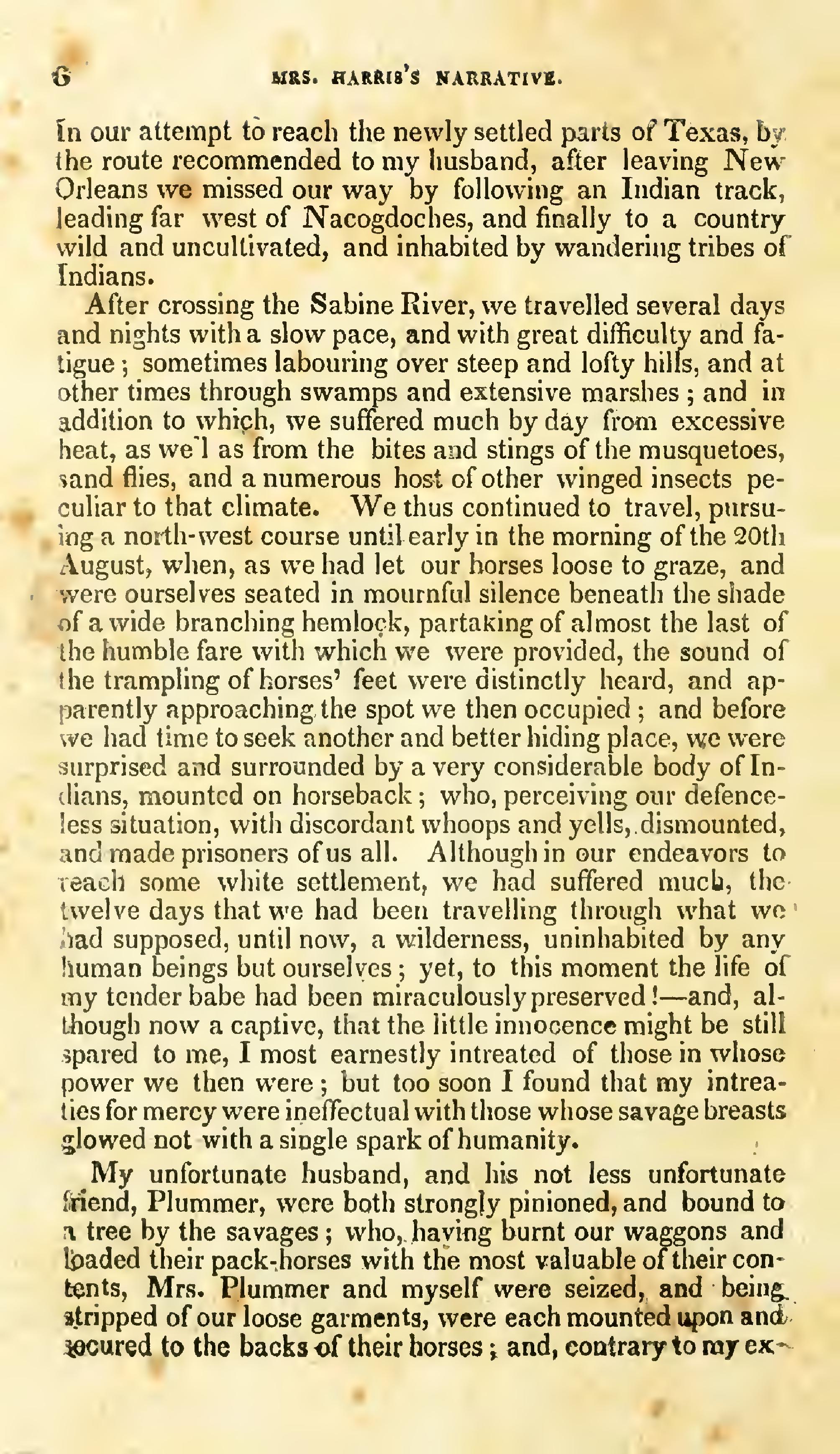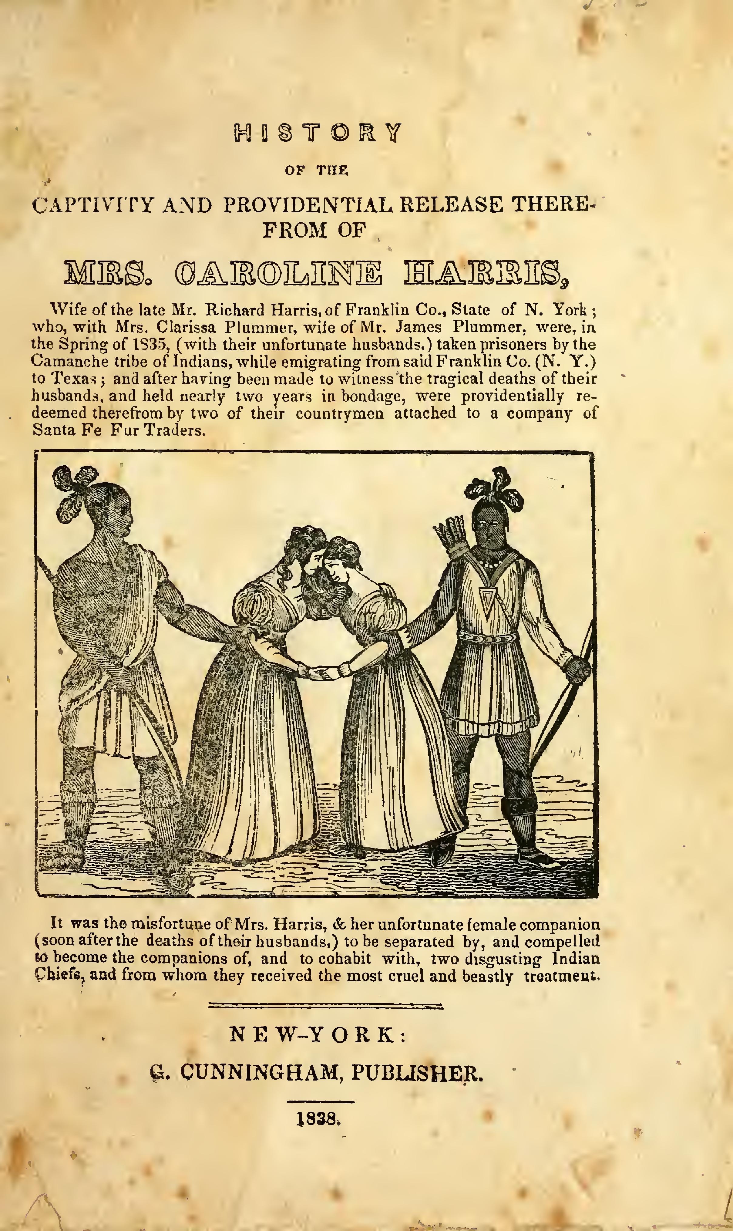 History of the captivity and providential release there from of Mrs. Caroline Harris, wife of the late Mr. Richard Harris, of Franklin Co, state of New York, who, with Mrs. Clarissa Plummer were in the spring of 1835 taken prisoners by the Camanche, tribe of Indians, while emigrating, New York, Cunningham, 1838