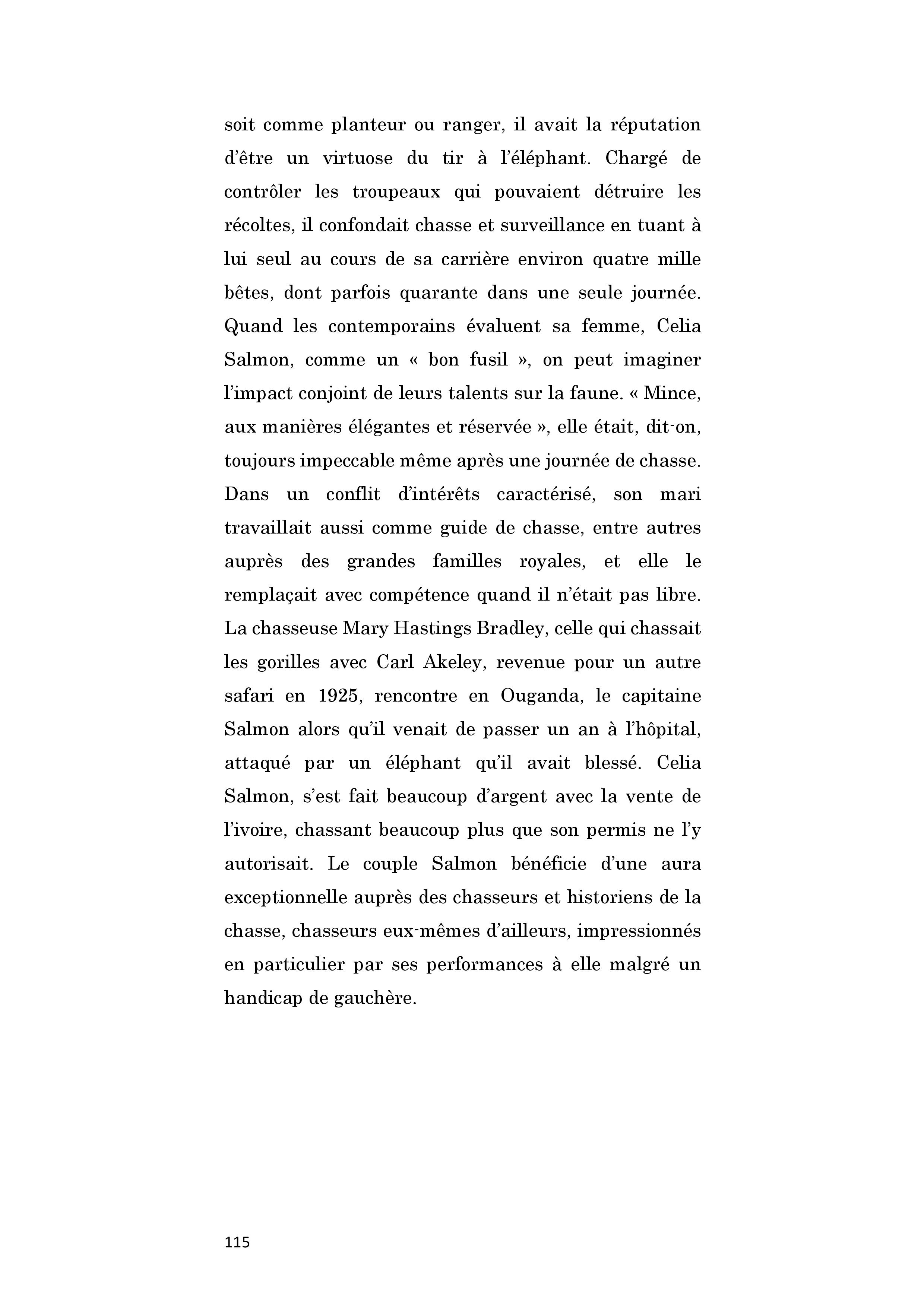 Cette Afrikaner épouse un des chasseurs les plus reconnus de l’époque, Roy John Salmon. Une fois retraité de sa ferme en Ouganda, il prend le poste de ranger. Chargé de contrôler les troupeaux qui pouvaient nuire aux récoltes, il tue parfois jusqu’à une quarantaine d’éléphants par jour. Celia le seconde parfaitement et le remplace lorsque qu’il est pris par d’autres obligations. Elle commercialise avec succès l’ivoire récolté.