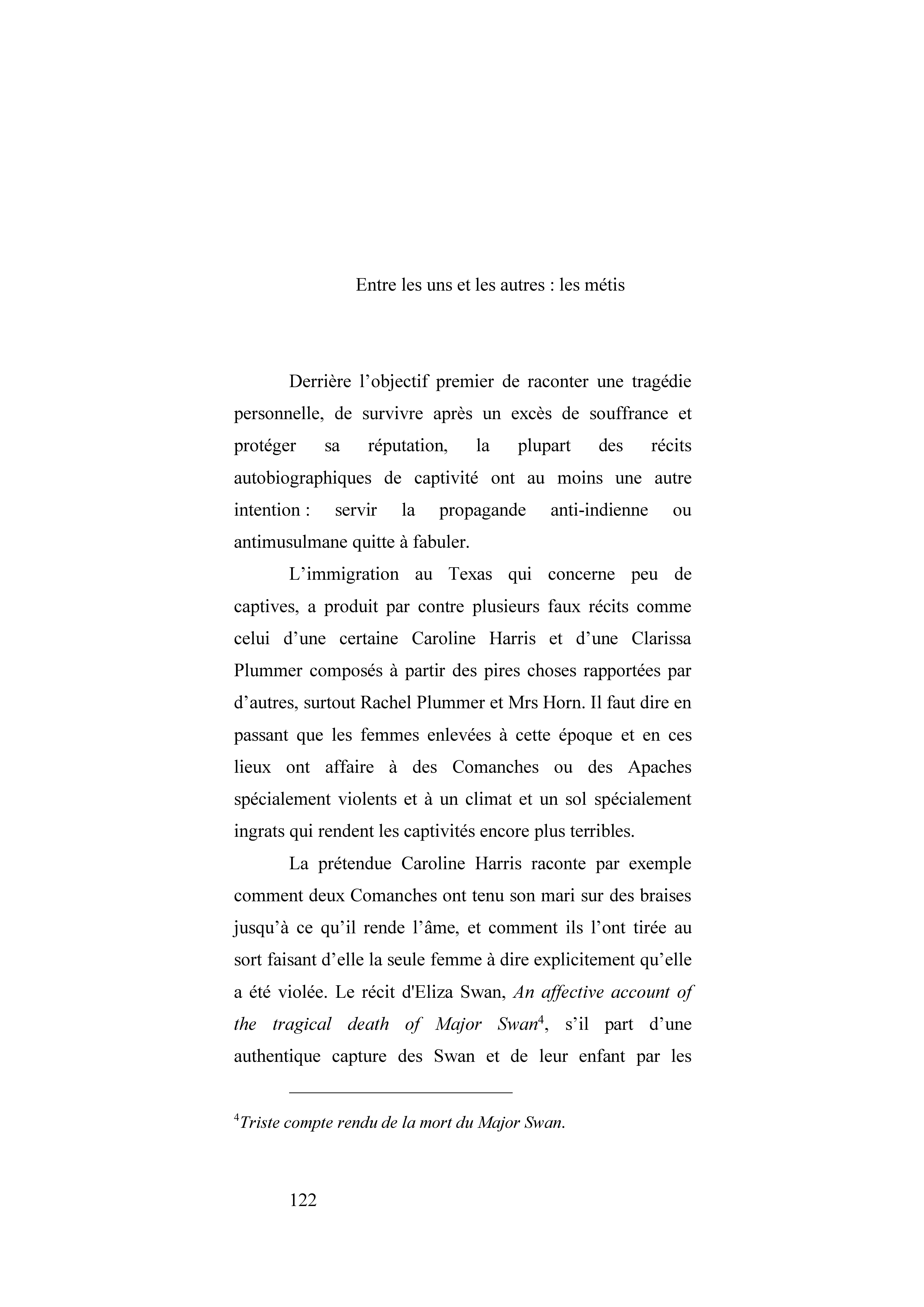 Le récit de Mrs Swan, An affective account of tragical death of Major Swan est un mélange de fiction et de réalité. En avril 1815 la famille est capturée par les Kiowas du Mississipi. Elle rapporte des scènes violentes, notamment du cannibalisme, elle est libérée par l’entremise d’Indiens christianisés.