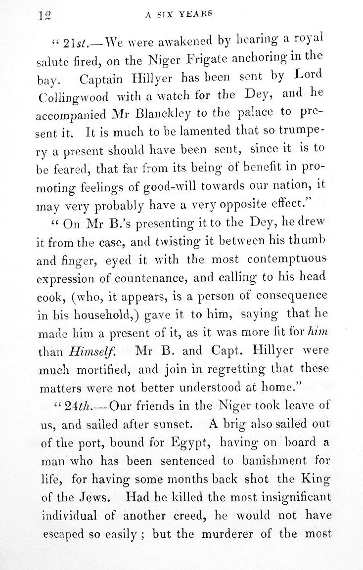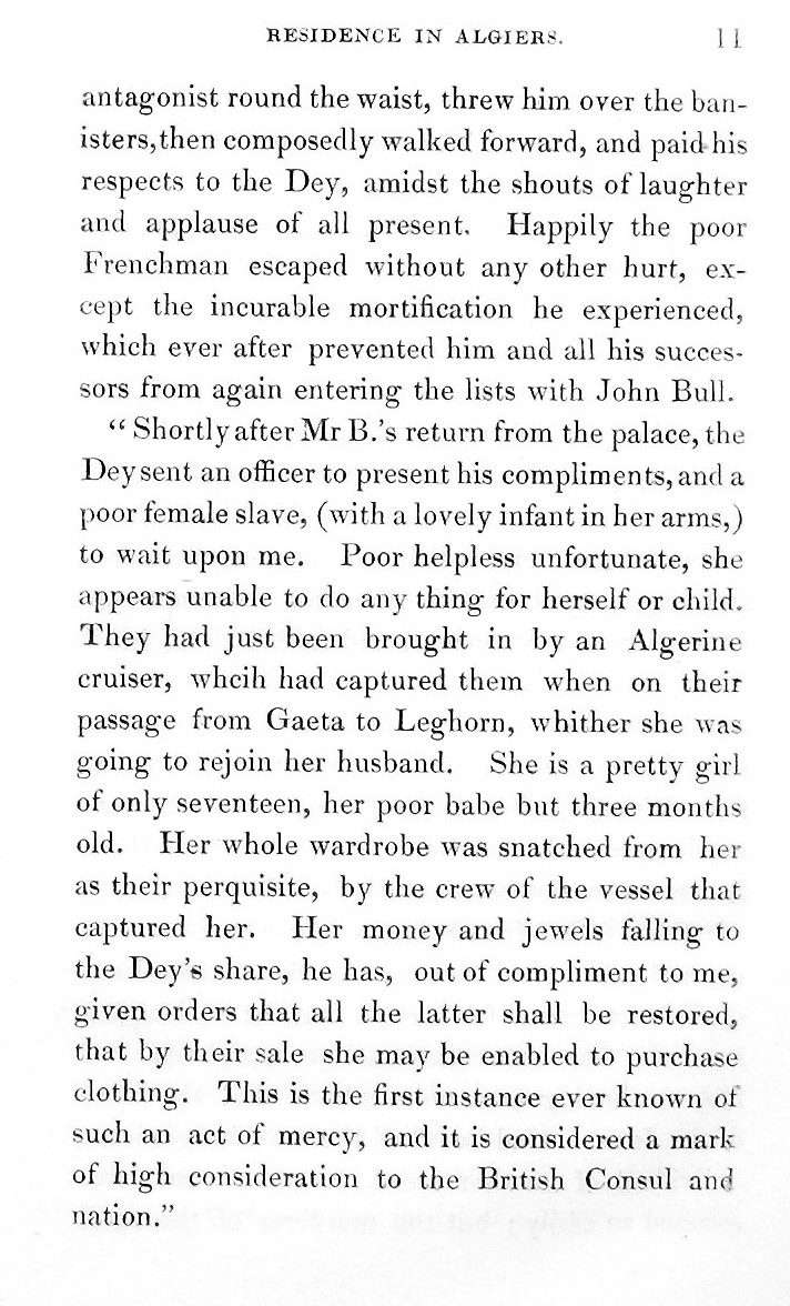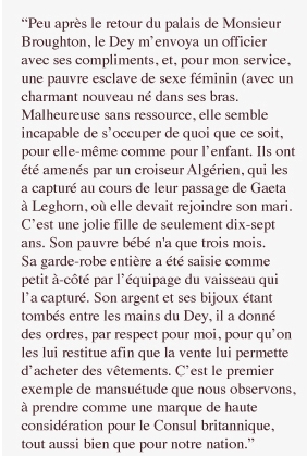 Fille du consul anglais à Alger, elle est, entre autre, témoin de la capture des Européens par les Barbaresques et des opérations de rachat. Entre 1806 et 1812, toute la famille profite d’une vie agréable à Alger, cependant sa mère et son père font tout ce qui est en leur pouvoir pour soulager la misère des captifs.