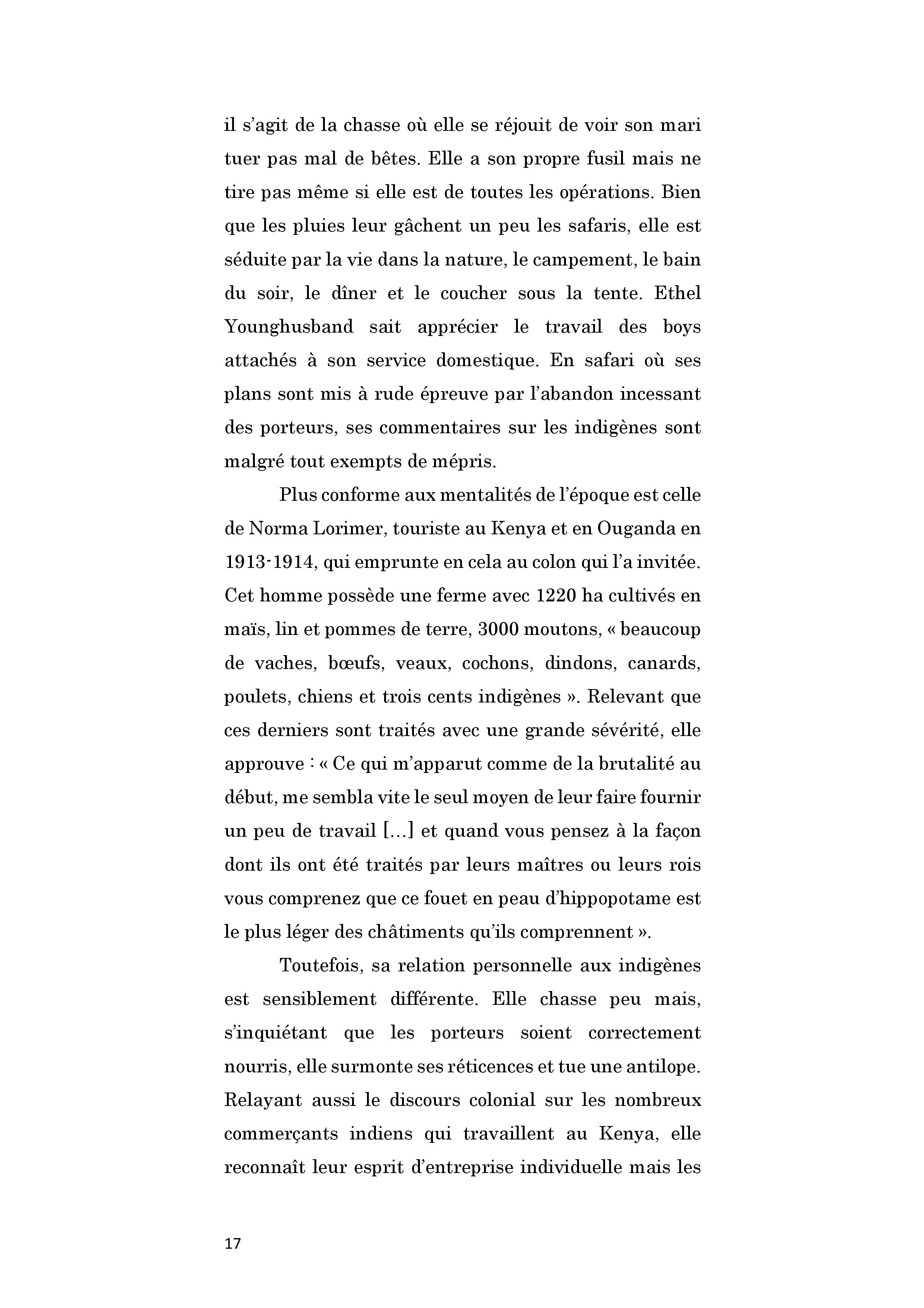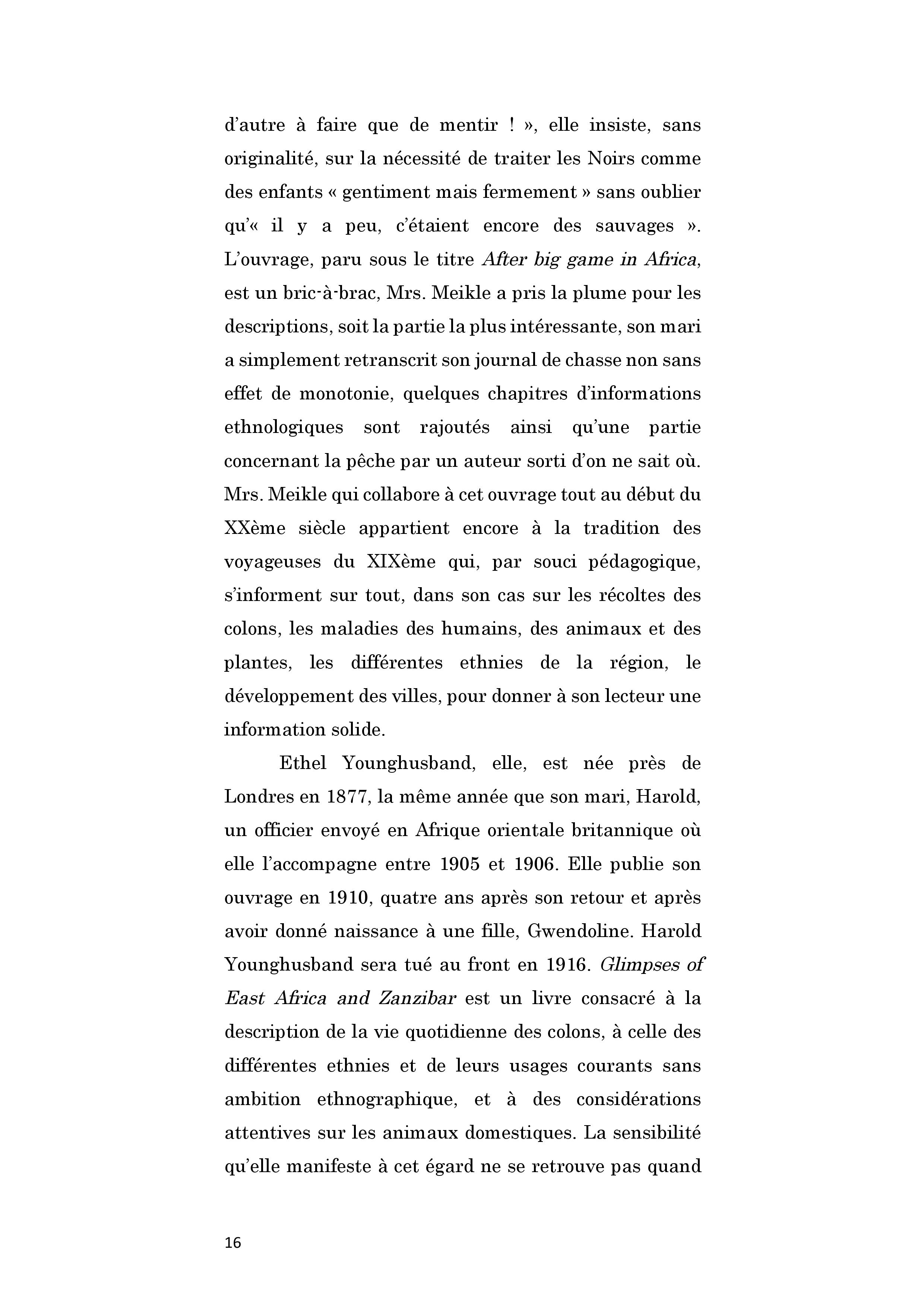 Britannique. Elle part avec son mari officier en Afrique orientale britannique où elle séjourne entre 1905 et 1906. Elle publie quatre ans après un livre rendant compte de la vie quotidienne des colons et des Africains en relevant la variation des usages selon les ethnies. Elle participe activement aux parties de chasse de son mari, s’enthousiasme de ses nombreuses mises à mort sans pour autant appuyer elle-même sur la gâchette.