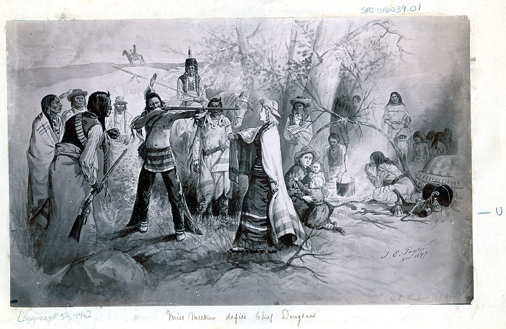 Capturé en 1879 dans le Colorado où son père occupait le poste d’Agent des Affaires indiennes du Colorado et tentait une politique d’ "américanisation » des Indiens de la région. L’affrontement a lieu en septembre 1879, alors que les colons occupent de plus en plus de terres indiennes. Tous les hommes Blancs sont massacrés, dont son père. Capturée à 21 ans elle sera délivrée par l’armée trois semaines plus tard. Pas d'autobiographie.