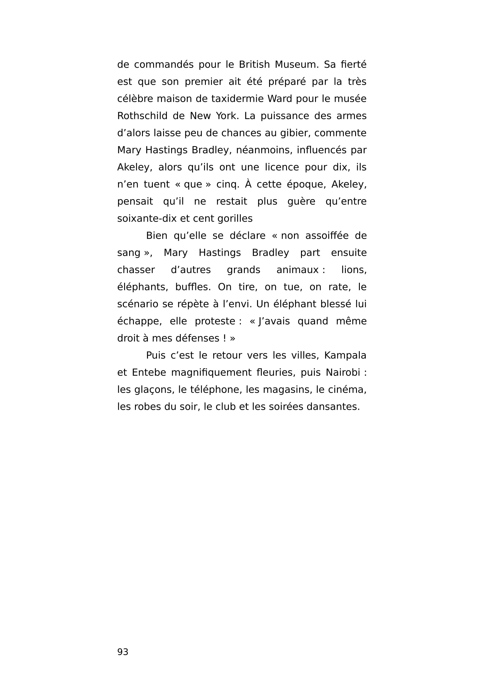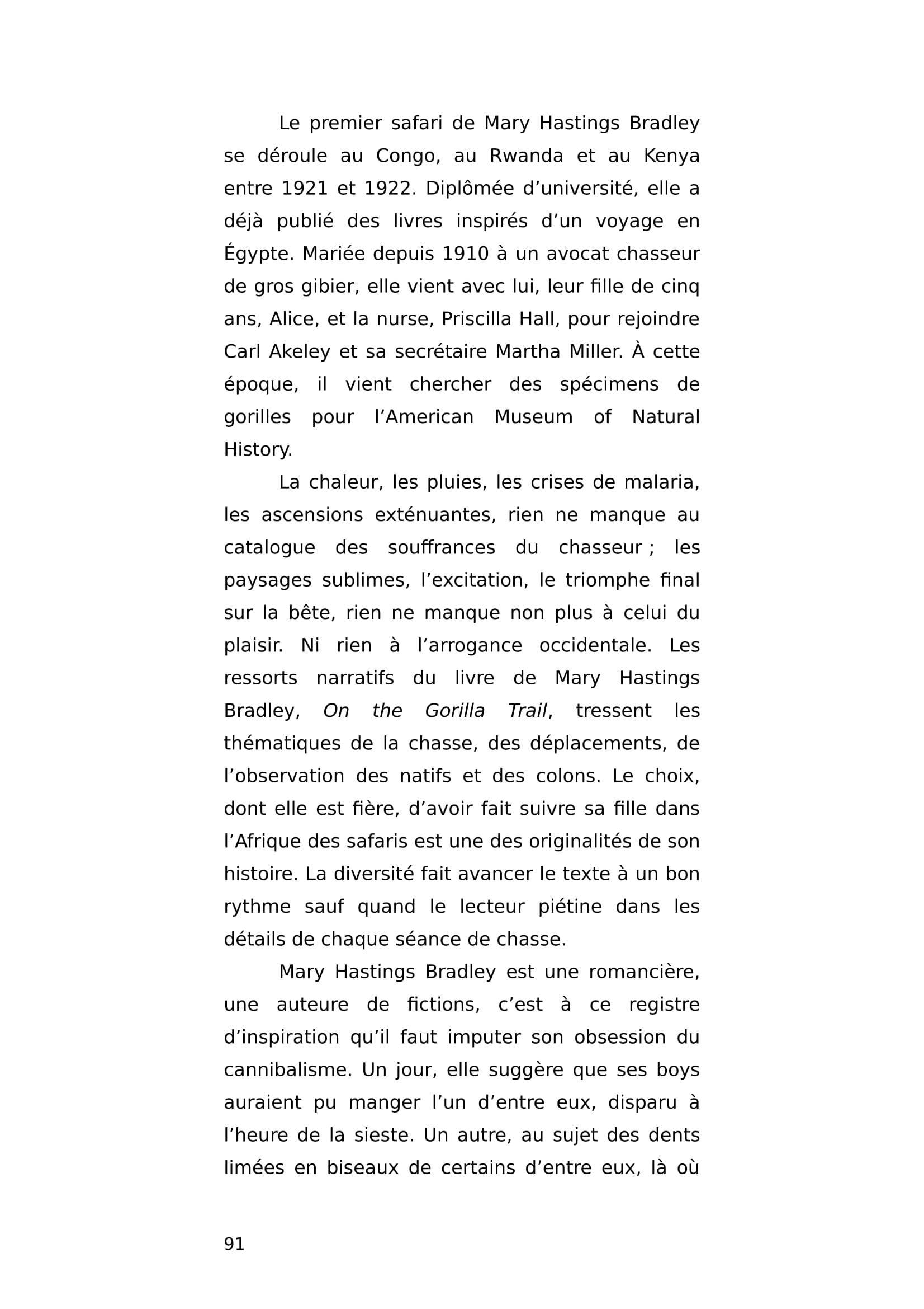 Riche et célèbre romancière américaine, Mary Hastings Bradley pratique ses premiers safaris au début des années 20 au Rwanda, au Congo et au Kenya. Sous l'autorité de Carl Akeley, elle et son mari tuent des chimpanzés alors qu'ils savent l'espèce déjà menacée. Fantasmant pas mal sur le cannibalisme, elle raconte sa gloire de chasseuse intensive et sa fierté de faire suivre sa fille dans plusieurs ouvrages dont un destiné aux enfants. Pendant la deuxième guerre mondiale, dans un tout autre registre, elle témoignera sur la condition spécifique des femmes et la libération des camps.